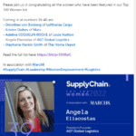 According to the publisher, Sean Ashcroft, “Supply Chain Digital’s Top 100 Women … are the most innovative, inspirational and strategically smart supply chain women on the planet.” He continues, “This list encompasses a mix of sectors from aviation, logistics, and supply chain, to tech, IT, manufacturing and F&B … These women are part of making the system work.”